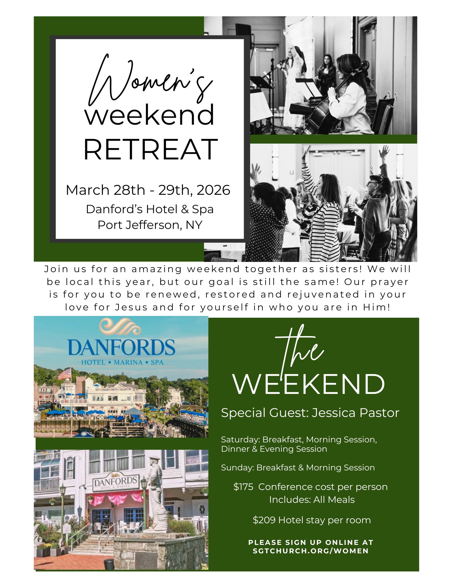After you have completed your registration and have paid in full for the Women's Away Retreat you will receive an e-mail confirmation with a special link to the hotel. This link is for Smithtown Gospel Tabernacle Women's Away Retreat only, with a special rate of $209 per night plus fees and tax for your stay at the hotel, for the weekend.